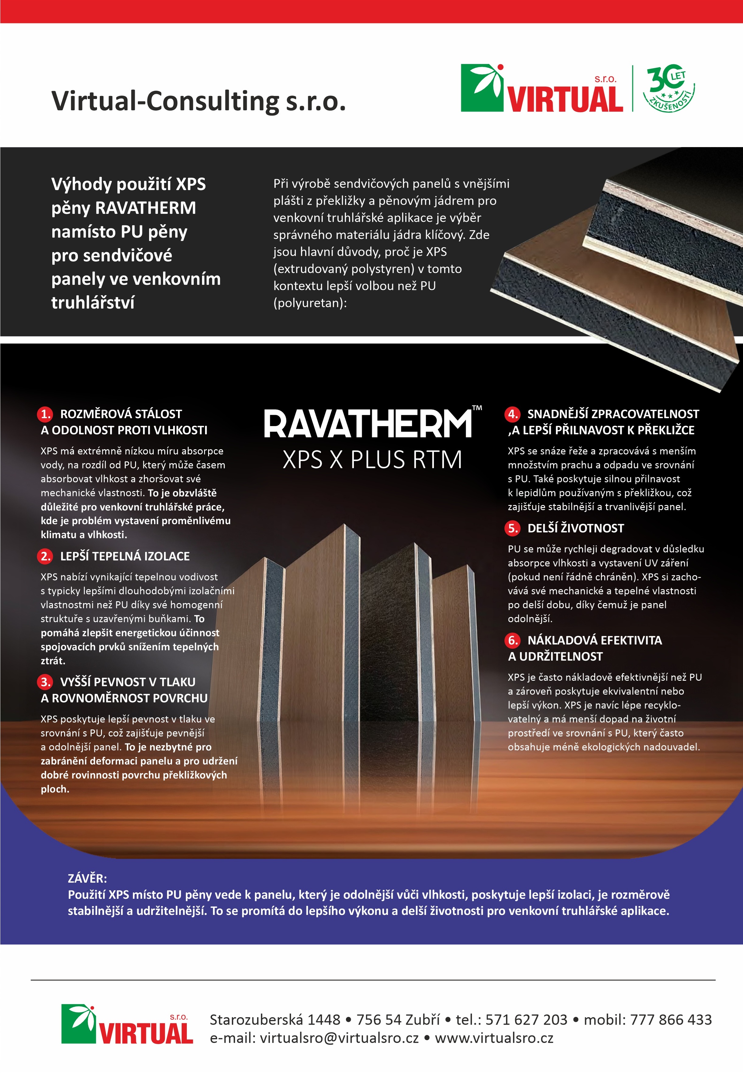 Pěna RAVATHERM™ XPS X PLUS RTM představuje moderní řešení pro výrobu sendvičových panelů v oblasti venkovního truhlářství, stavebnictví i průmyslových aplikací. Díky svým technickým parametrům a dlouhodobé stabilitě je ideální volbou pro náročné konstrukce, kde je klíčová pevnost, odolnost vůči vlhkosti a přesnost zpracování.