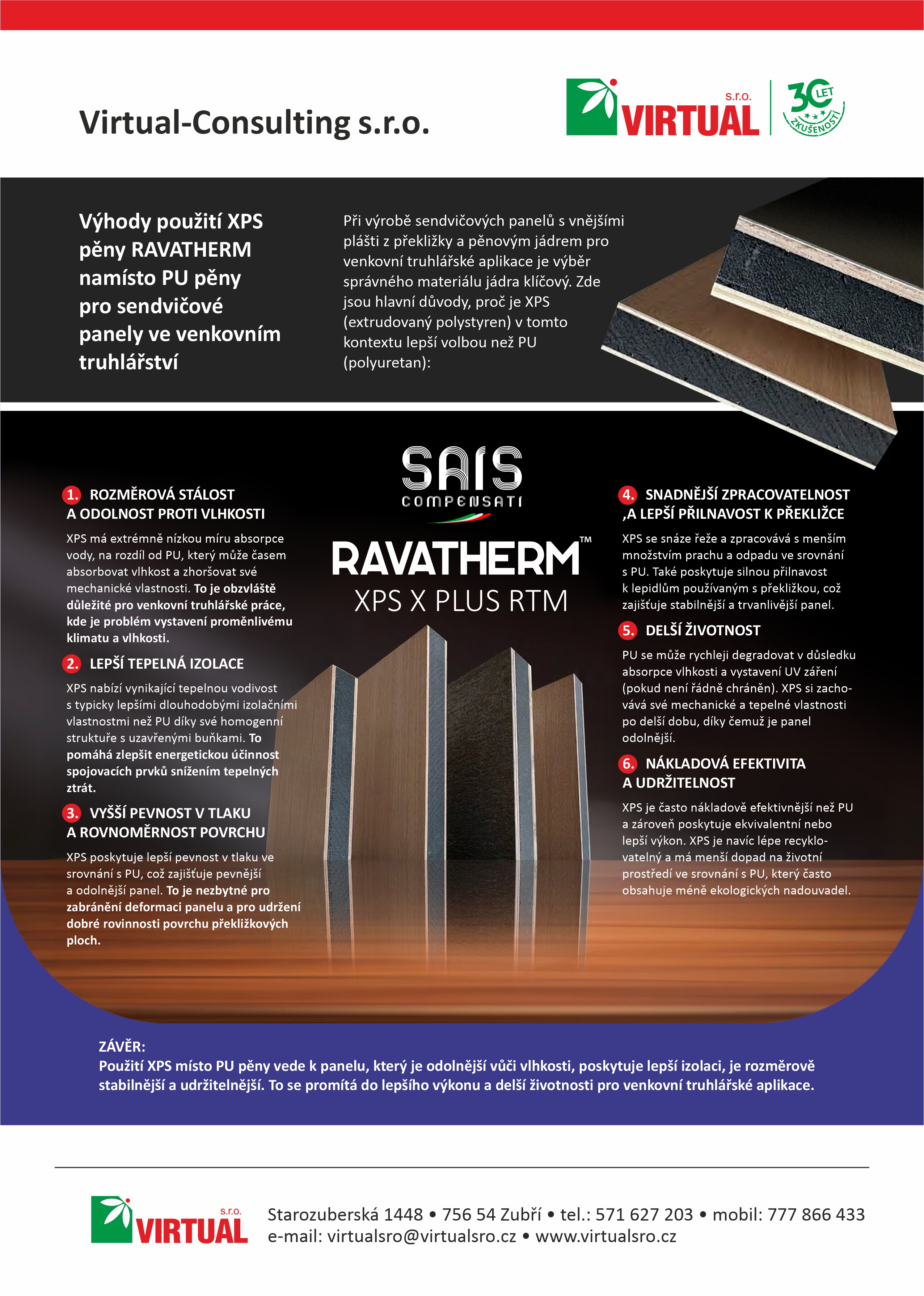 Pěna RAVATHERM™ XPS X PLUS RTM představuje moderní řešení pro výrobu sendvičových panelů v oblasti venkovního truhlářství, stavebnictví i průmyslových aplikací. Díky svým technickým parametrům a dlouhodobé stabilitě je ideální volbou pro náročné konstrukce, kde je klíčová pevnost, odolnost vůči vlhkosti a přesnost zpracování.